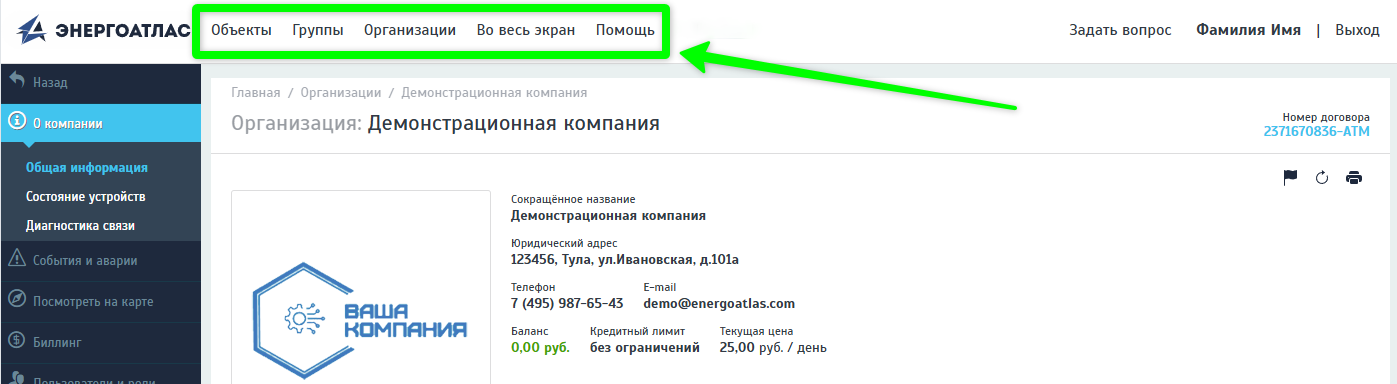- Помощь. Ссылка позволяет перейти на информационный портал Системы мониторинга и управления "Энергоатлас", в котором вы в данный момент находитесь.