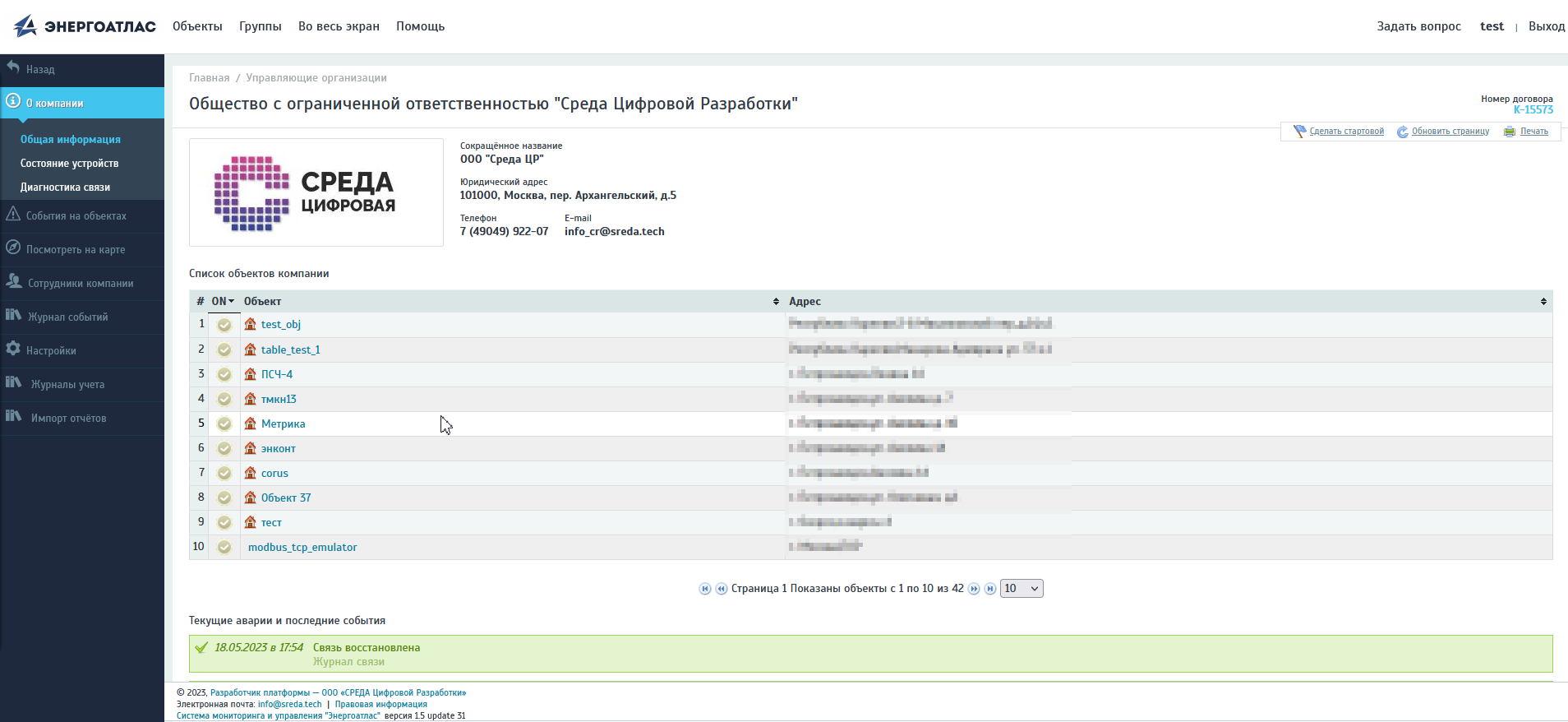 Пользователю доступны для просмотра объекты, зарегистрированные на его организацию, и права на просмотр которых выделил администратор компании. Более подробная информация о предоставлении доступа к объектам организации конкретным пользователям рассказано в разделе «Настройки доступа». На рисунке представлен основной экран, с которого возможен переход между объектами пользователя. Для удобства пользователя есть возможность увеличить список отображаемых объектов (по 25, по 50 и т.д.) и избежать постраничной прокрутки с помощью переключателя в основании таблицы. Кроме того, таблица поддерживает режим сортировки по алфавиту по любому столбцу таблицы – по наименованию объекта, по адресу, по управляющей компании или по текущему состоянию объекта. Сортировка производится при нажатии мышкой на заголовок конкретного столбца таблицы. При этом возможна сортировка по нескольким столбцам одновременно, для чего необходимо перевести курсор мышки на соседний столбец и нажать на заголовок столбца, удерживая на клавиатуре клавишу «Shift».