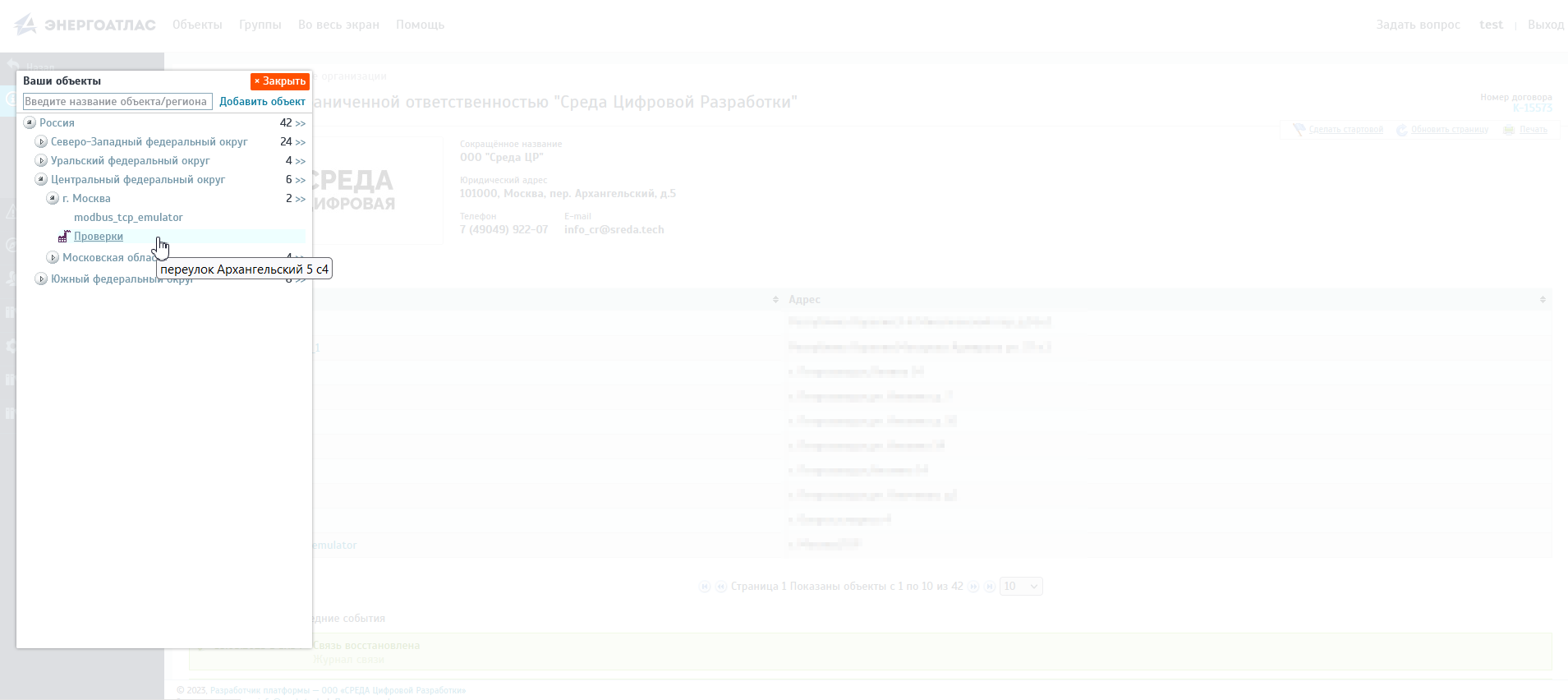 Так же имеется возможность быстрого перехода между объектами посредством специального бокового меню, которое вызывается путем нажатия на кнопку "Объекты" в левой верхней части экрана.