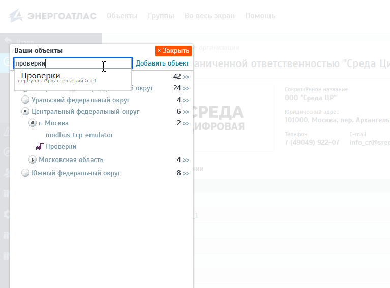 В этом же меню, в верхней его части, имеется поле для поиска объектов по названию.