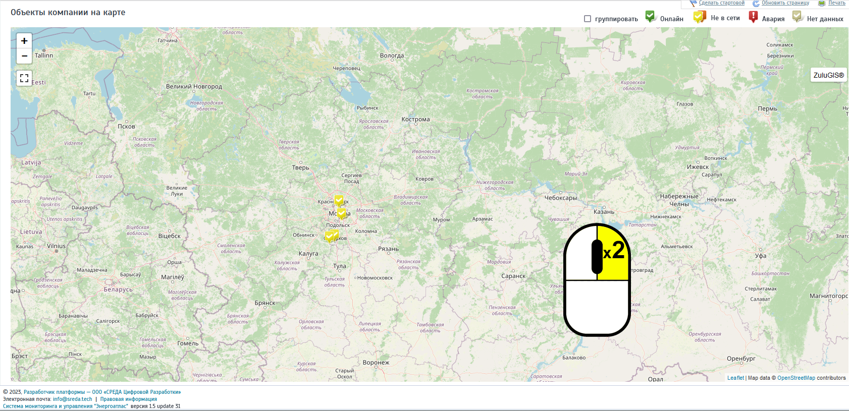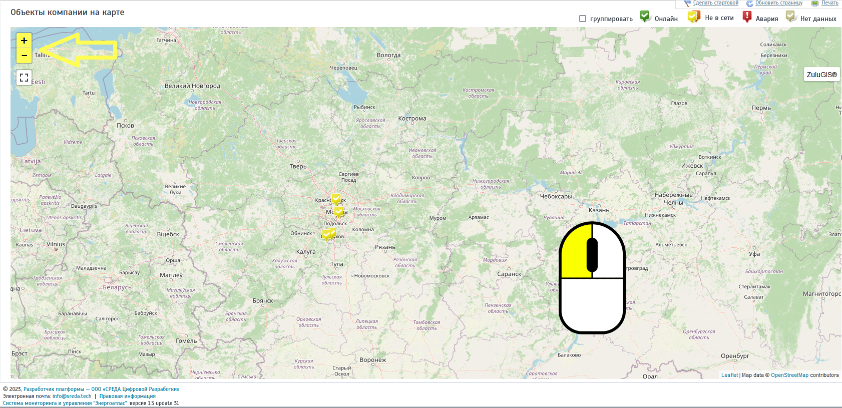 Управление масштабом карты производится с помощью мыши и отвечает общепринятым подходам при работе с географическими информационными системами.