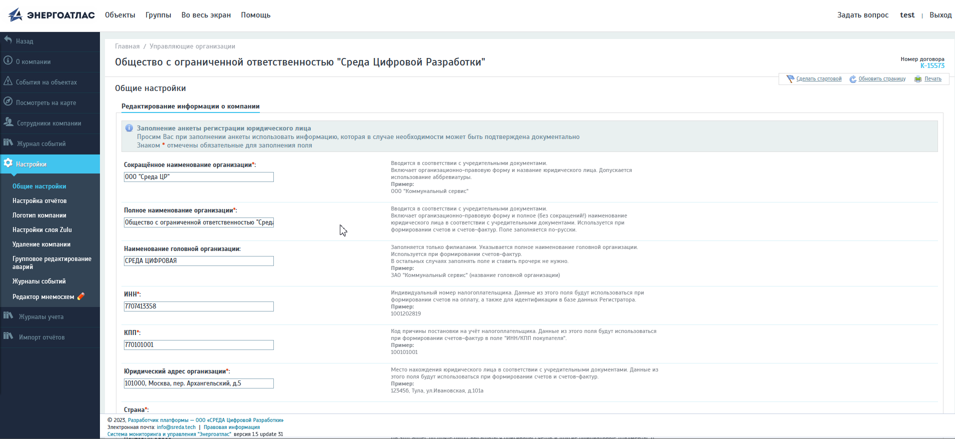 Для изменения данных о компании надо открыть закладку «Настройки» - «Общие настройки». Внесённые данные впоследствии будут использованы при просмотре всех отчетных форм объектов предприятия, архивировании событий и печати документов. Поля, отмеченные знаком *, являются обязательными для заполнения. Правила заполнения полей отвечают тем же требованиям, что описаны в разделе Регистрация организации и настройка данных пользователей.