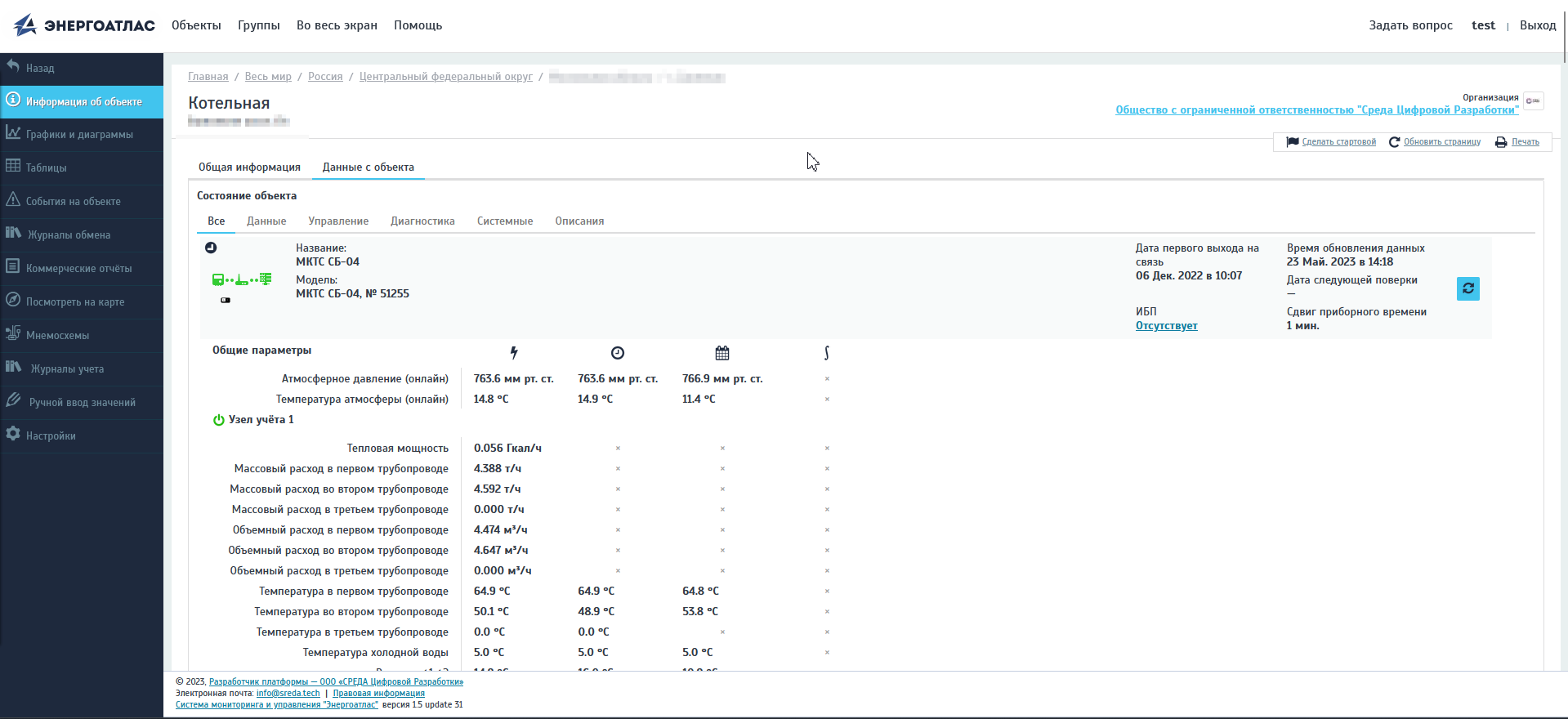 Отображаемые на странице объекта данные измерений, система Энергоатлас автоматически получает из текущих значений измеряемых параметров. В базовой конфигурации Энергоатласа, значение по умолчанию квантования для аналоговых данных (температура, напряжение, давление и пр.) 15 мин. При этом, обратите внимание, что время обновления показателей дискретных сигналов ограничено возможностями коммуникационных каналов и временем обработки данных SaaS-сервисом и, как правило, не превышает несколько секунд. В случае нарушения коммуникации с объектом отображаются последние полученные значения параметров (цвет шрифта значений меняется на серый). Время обновления данных указано в правой части экрана раздела параметров измерения.