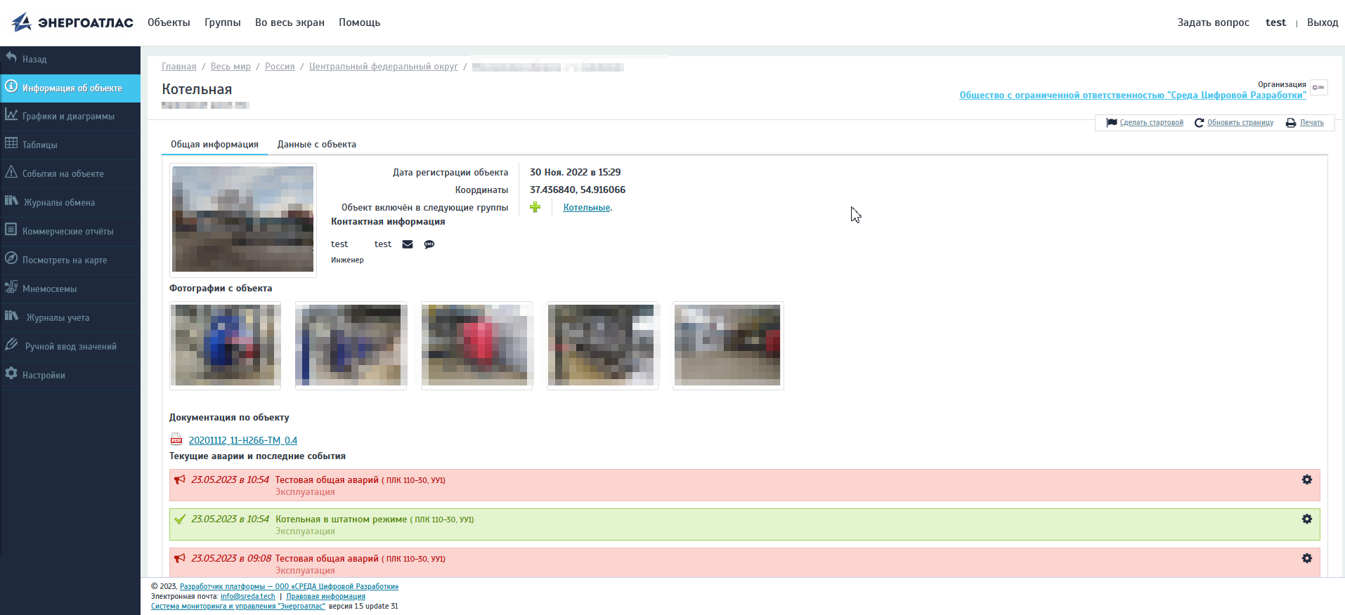 В данной вкладке дается краткая общая информация об объекте мониторинга: наименование и адрес объекта, фотографии объекта, документация по объекту, технический состав приборов, персональные данные специалистов, ответственных за эксплуатацию оборудования, текущее состояние объекта в режиме On-line, текущие и завершенные аварийные состояния объекта. Кроме основной информации по объекту на странице приводятся данные о том, в какие группы включен объект. Нажатие на название группы позволяет автоматически перейти к самой группе и ее настройкам. О работе с группами объектов и возможностях группирования рассказывается в разделе Работа с группами объектов.