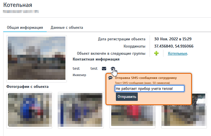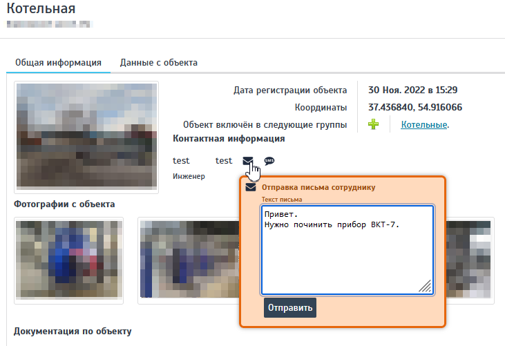 **Внимание!** В таблице контактной информации имеется возможность оперативной отправки сообщений специалистам ответственным за объект.