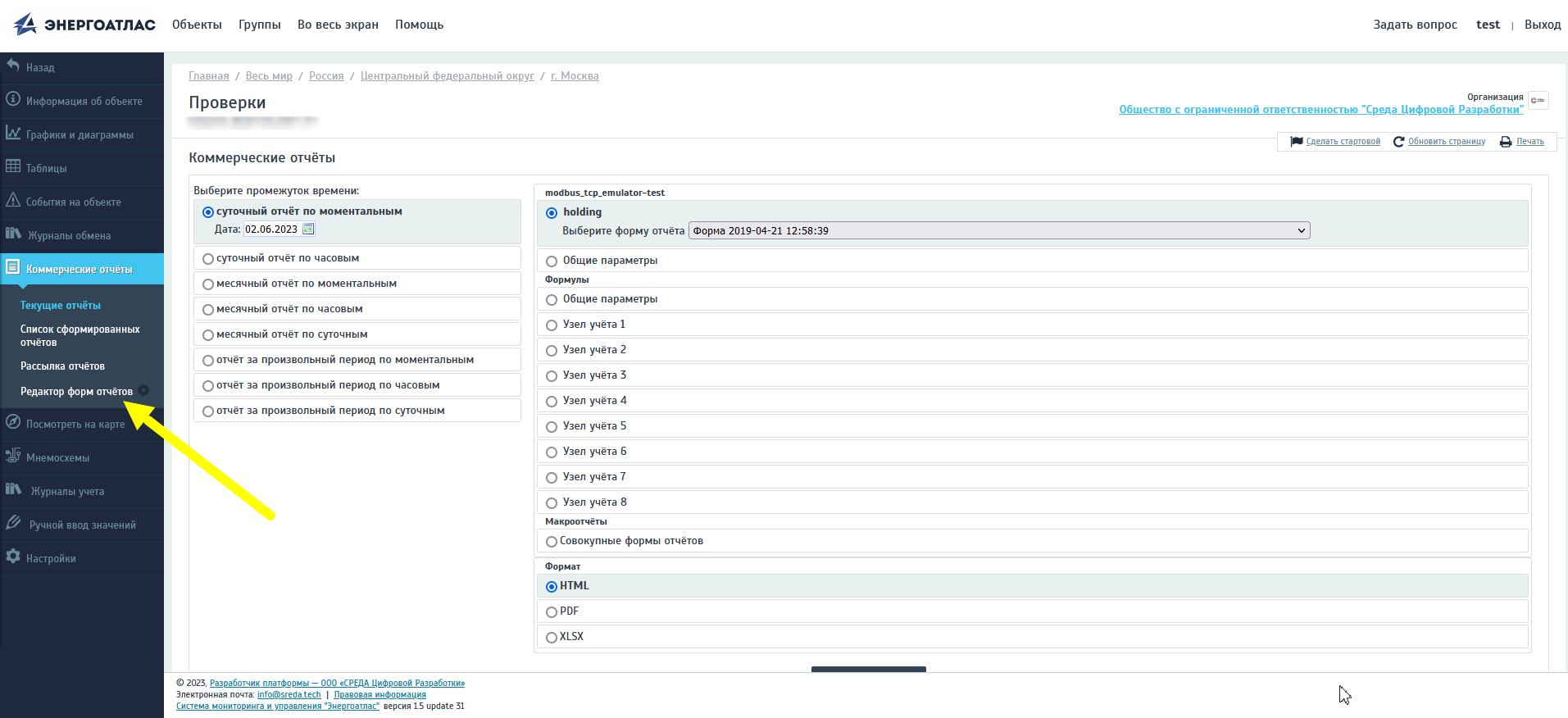 Система предоставляет возможность формирования коммерческих отчетов в удобном пользователю виде. Для этого ресурс содержит «Редактор форм отчетов», который доступен после нажатия соответствующего пункта во вкладке «Коммерческие отчеты» на странице активного объекта. Перейдя по ссылке на страницу редактора, у Вас появляется возможность создать свою форму отчета – которая будет содержать необходимые Вам параметры измерений, энергоучета и расположение элементов. При этом за основу Вы сможете взять стандартные (общепринятые) формы отчетов с учетом типа устройства или технологической схемы энергоучета.