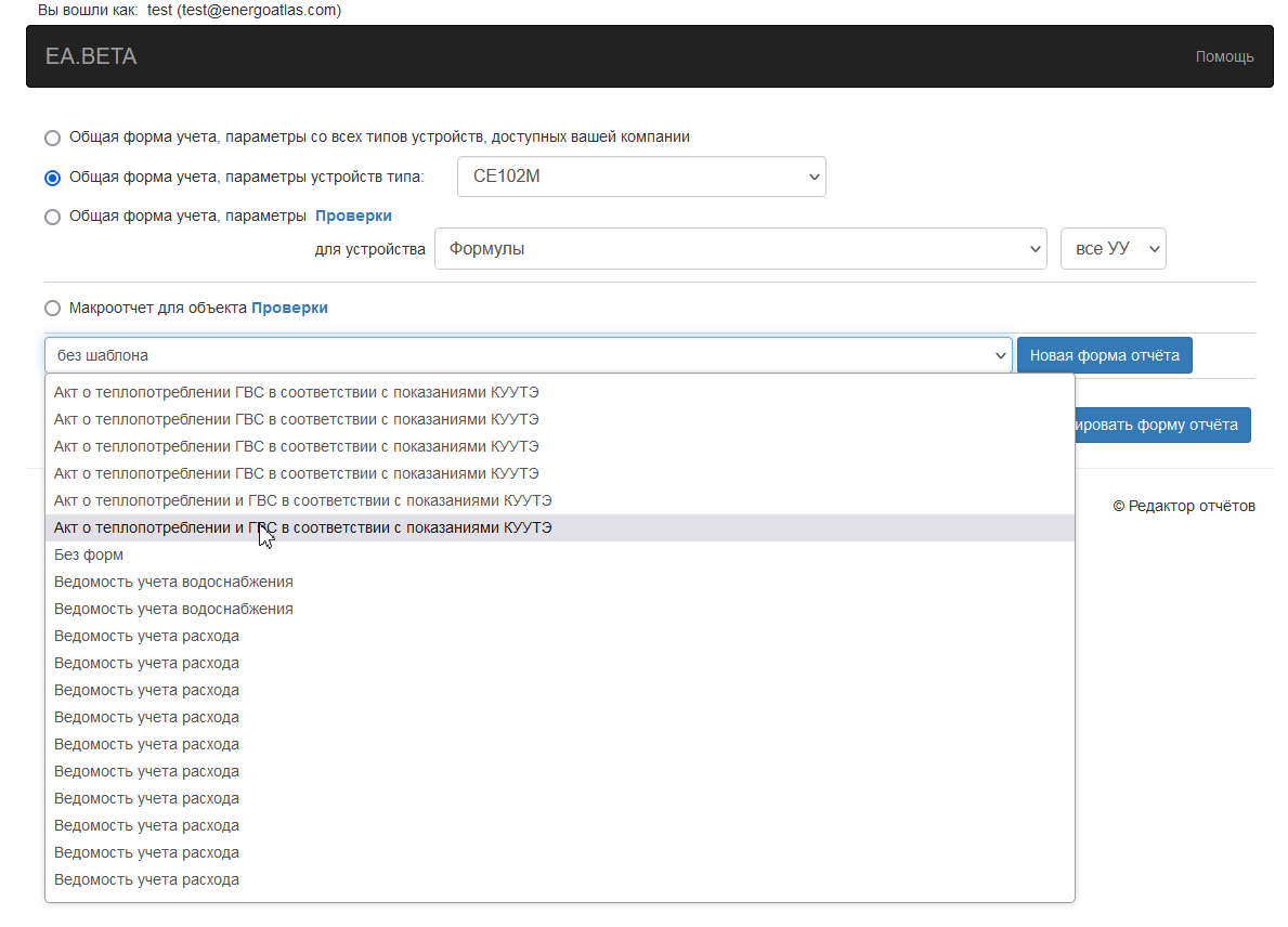 Редактор форм отчетов дает возможность начать работу в одном из нескольких режимов. Выбор режима создания/редактирования формы отчета определяет какие именно данные и параметры с устройств пользователь сможет включить в форму отчета.