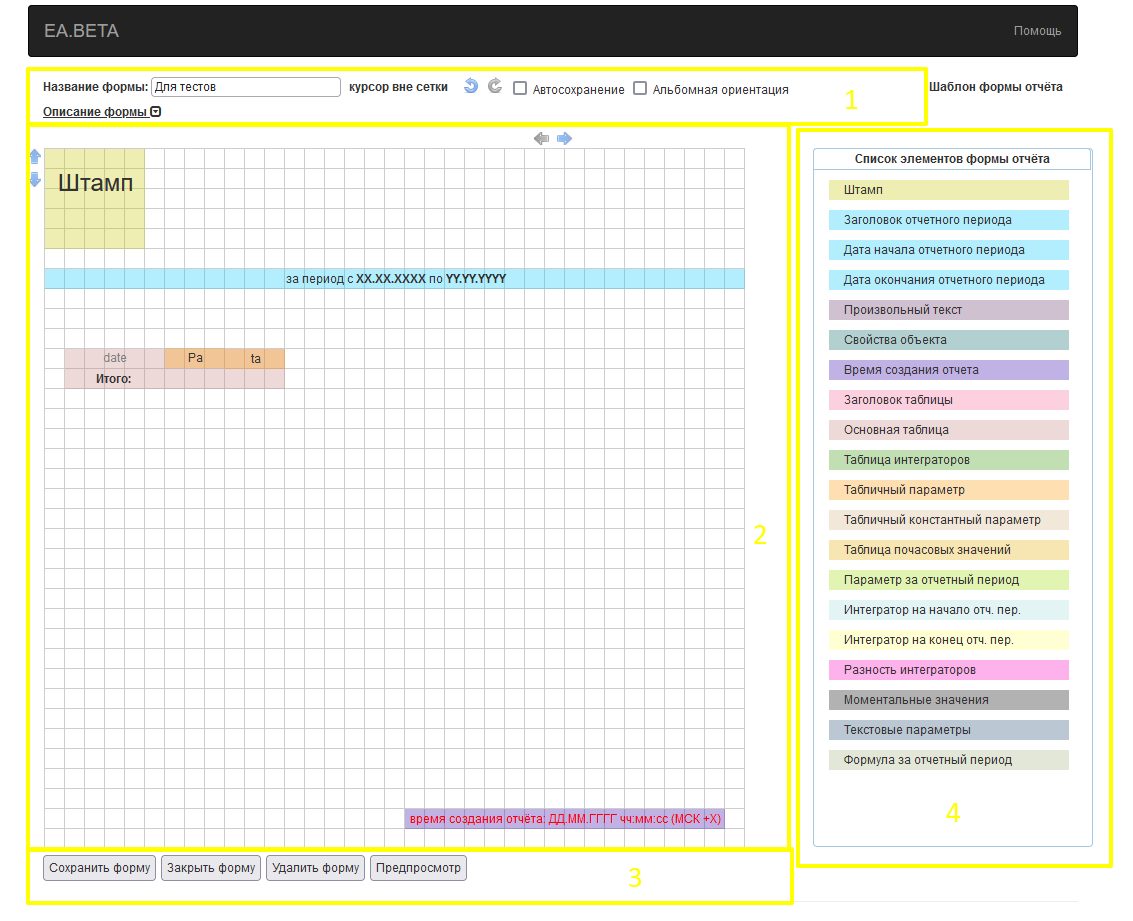 После нажатия кнопки «Новая форма отчета» или «Редактировать форму отчета» откроется непосредственно сам редактор.