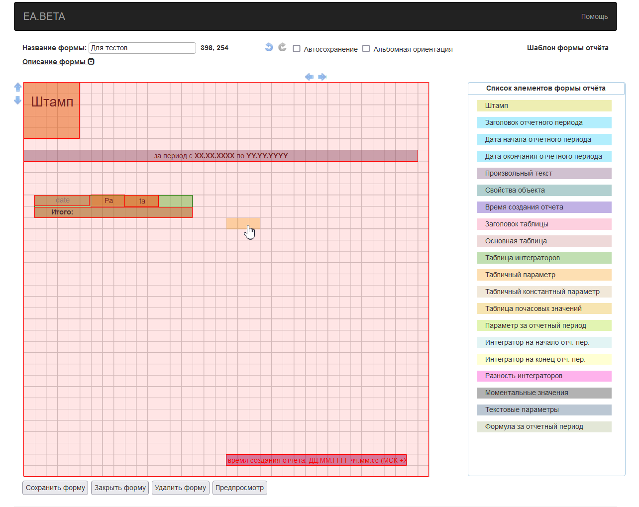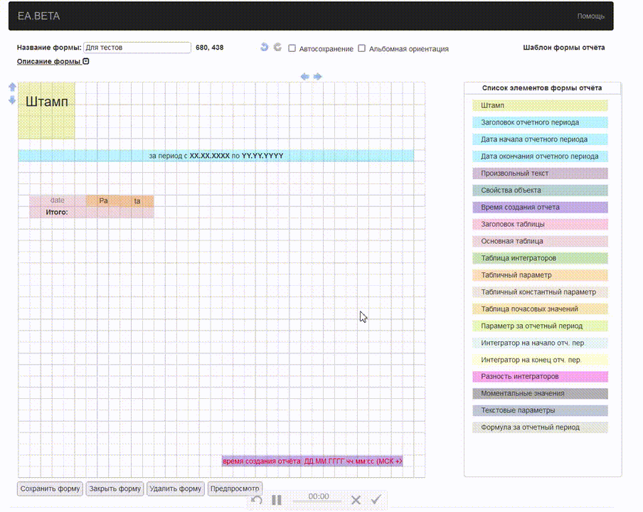 Верхняя часть страницы Редактора содержит ряд элементов управления. В поле «Название формы» пользователь может ввести название, которое он хочет видеть у создаваемого им формы отчета. При этом система предложит пользователю свое название - по умолчанию форма отчета будет носить имя вида «Форма - Дата создания - Время создания». Поставленная галочка «Автосохранение» дает указание системе делать автоматическое сохранение формы каждые 5 минут работы пользователя, чтобы не потерять данные. Нажатие символов позволяет отменить или повторить ввод (последнее действие пользователя). Кнопки в виде вертикальных или горизонтальных стрелок в верхней и левой части страницы добавляют/уменьшая ширину или высоту рабочего поля Редактора.\