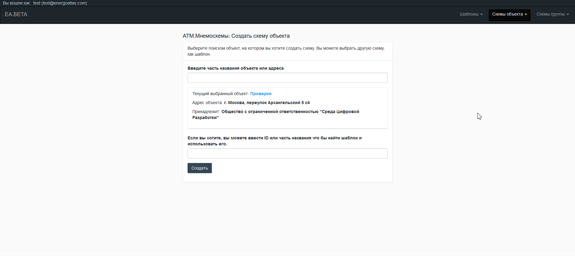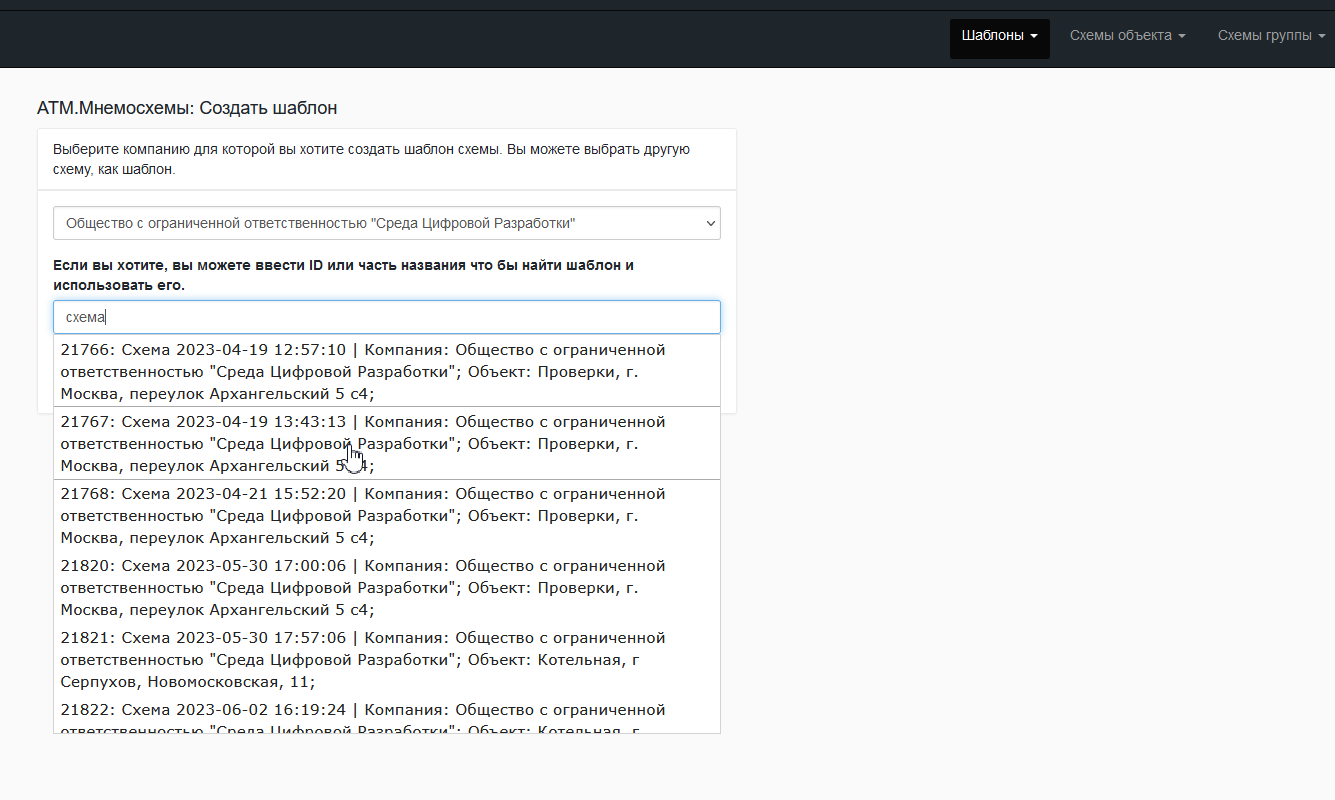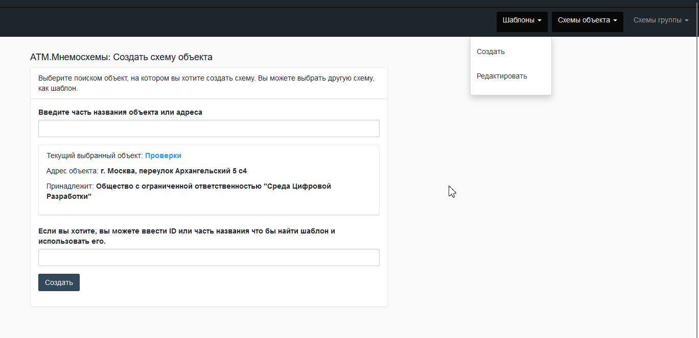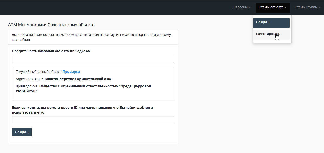 Для создания шаблона/мнемосхемы необходимо в верхнем меню в разделе "Шаблоны" или "Схемы объекта" выбрать "Создать", а для редактирования существующего шаблона/мнемосхемы - "Редактировать".