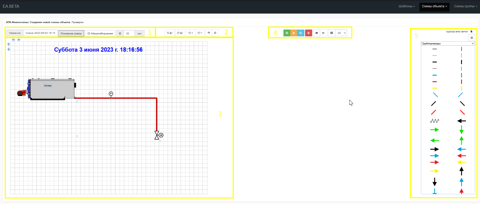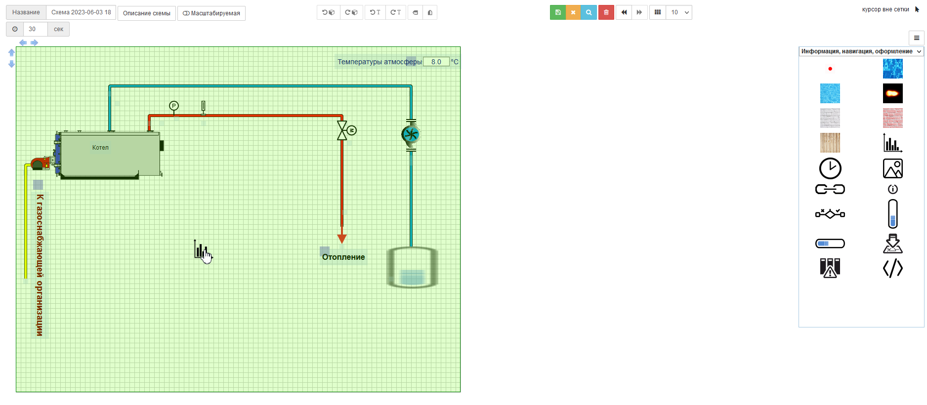 и возвращает пользователя назад к основной странице редактора схем для выбора другого шаблона/мнемосхемы, а с символом дискеты для сохранения текущей мнемосхемы. -
