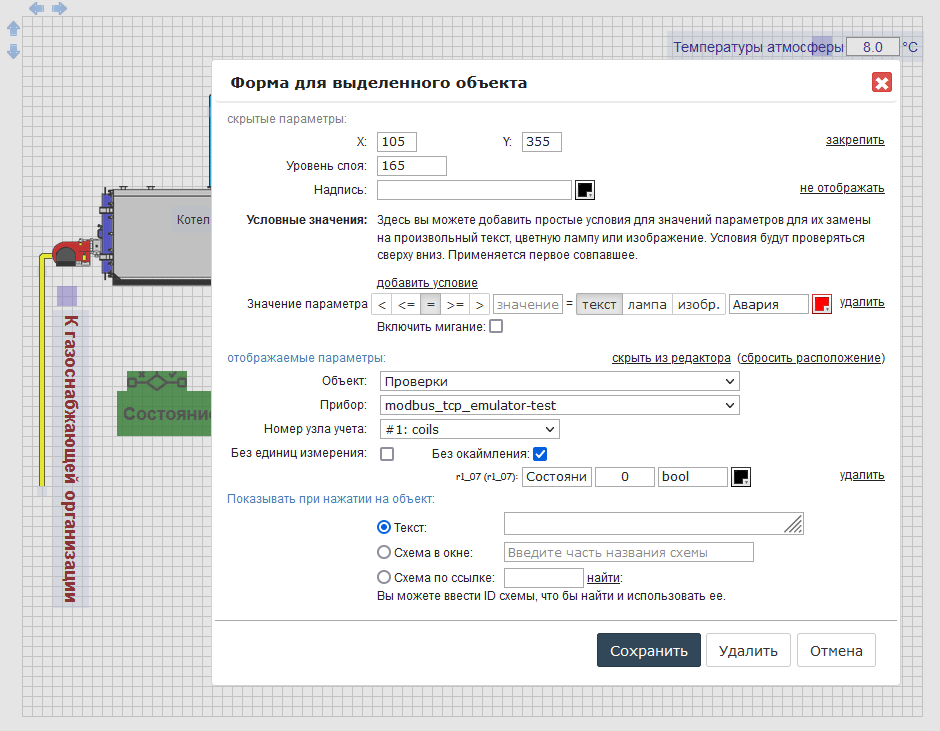 Окно настроек функционального элемента мнемосхемы\