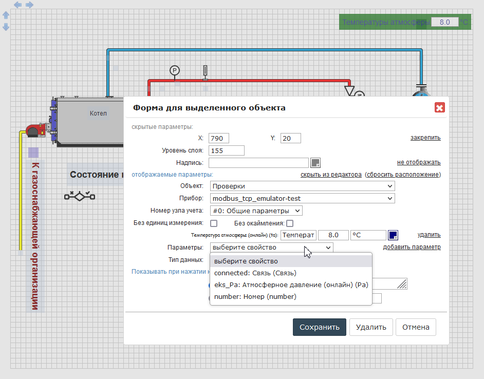 Для отображения измеряемых параметров нужно открыть настройки элемента. В примере на рисунке мы сперва выбрали элемент «Невидимый» из библиотеки «Пометки» и поместили его вверхний угол мнемосхемы. Зайдя в его настройки двойным щелчком мыши, мы выбрали объект и устройство, к которому будет привязан данный элемент схемы. После этого в зависимости от типа устройства система предложит выбрать узел учета (#0, #1, #2 …), параметры которого мы хотим вывести на схеме. Далее в ниспадающем меню «Выберите свойство» выбираем измеряемый параметр и нажимаем кнопку «Добавить параметр». В примере на рисунке мы уже температуру атмосферы, поэтому в ниспадающем списке она отсутствует. Количество параметров, которое можно добавить в этом окне, ограничено только общим количеством доступных параметров для данного узла учета конкретного устройства на объекте. Выбрав и добавив параметры, система сразу отображает условное обозначение параметра (например, ta, t1, P1 и т.д.), которое может быть изменено пользователем в соответствующем поле. Единицы измерения не могут быть изменены в окне настроек элемента во избежание некорректности восприятия отображаемой информации (измеренных величин).