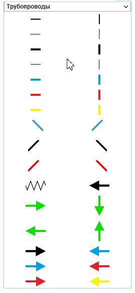 Трубопроводы - Содержит различные линии стрелки. Например: красный цвет обычно используется для труб теплоснабжения, синий для водоснабжения, а желтый для газоснабжения, стрелки применяются для указания направления и т.д.\
