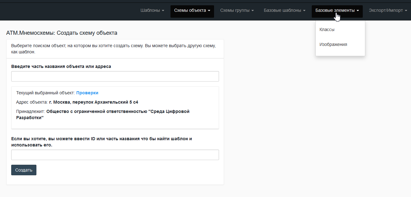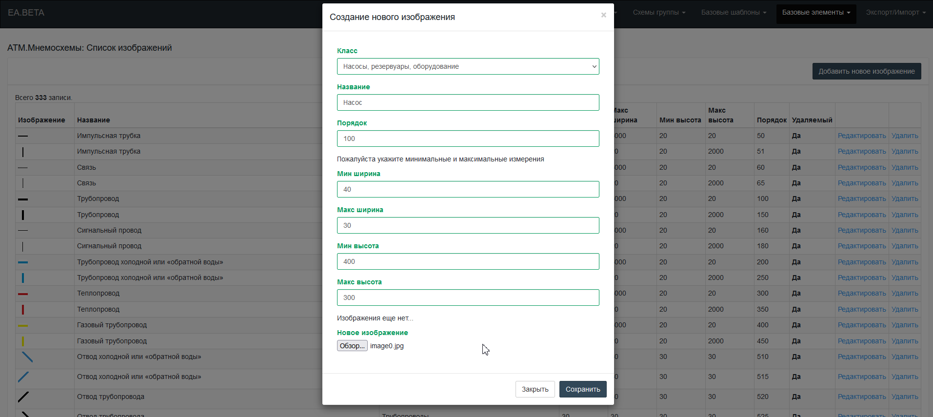 Кроме имеющихся элементов вы можете самостоятельно загрузить собственные в виде изображений. Для этого в основном окне Редактора мнемосхем в верхем меню необходимо перейти в раздел "Базовые элементы" и выбрать "Изображения", пункт меню "Классы" предназначен для создания собственных библиотек на подобии вышеперечисленных.