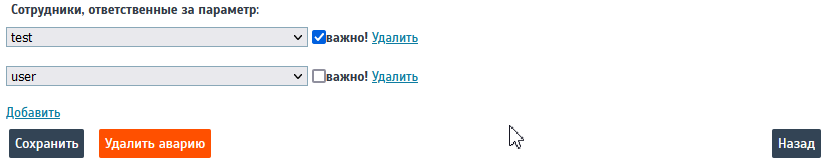 Сотрудники, ответственные за параметр - в поле указывается конкретный сотрудник предприятия, ответственный за эксплуатацию данного параметра на конкретном объекте. О том как добавлять ответственного описано в разделе Информирование об аварии или событии данного руководства.