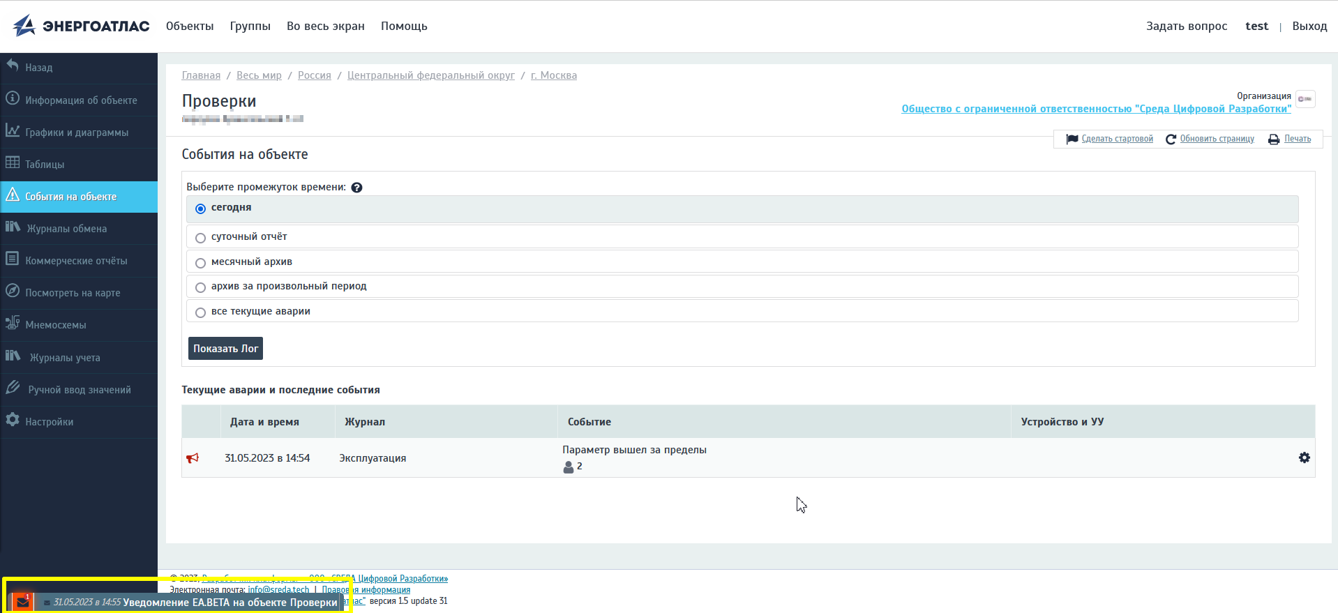 Внимание! Звуковое оповещение (в случае установленной опции важно!) и уведомление в левой нижней части экрана, будут присутствовать при каждом входе ответственного сотрудника в систему, пока не будут прочтены соответствующие системные уведомления об авариях или событиях в "Личных сообщениях".