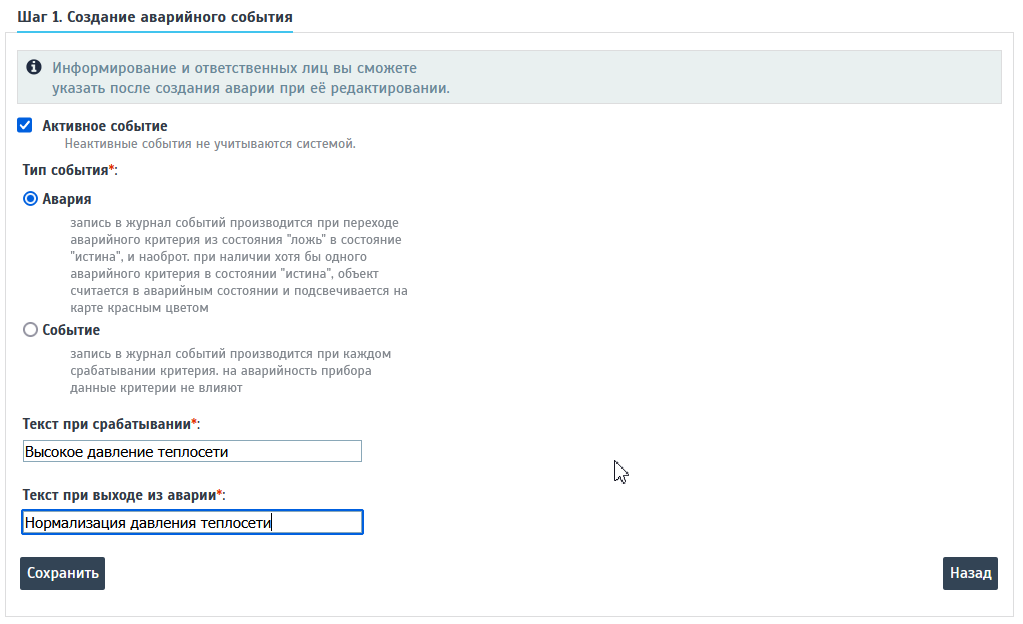 Шаг 1. В открывшемся окне настройки включаем новую аварию, введя наименование новой аварии - "текст при срабатывании", данном случае - «Высокое давление теплосети». А "Текст при выходе из аварии" - «Нормализация давления теплосети»** (При рассылке аварийных сообщений SMS, E-mail, архивации событий, используются эти наименования аварийных событий).