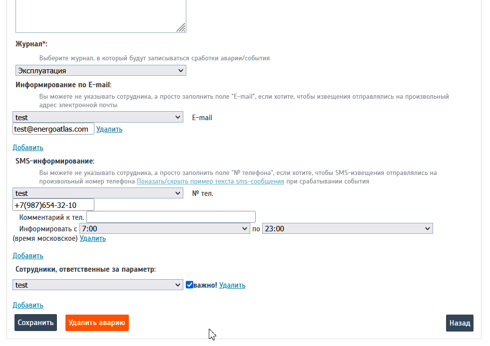 Определяем порядок информирования сотрудников об аварийном событии с помощью кнопки «Добавить» и выбора имени сотрудника компании из ниспадающего меню.