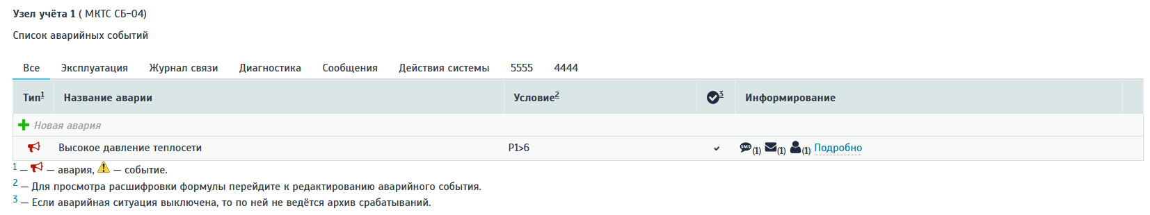 Результат. Для завершения редактирования аварийного параметра сохраняем настройки аварийного события нажатием кнопки «Сохранить» окна управления и переходим к списку всех аварийных параметров узла учета, где мы можем увидеть появление нашего нового аварийного события с введенными настройками.