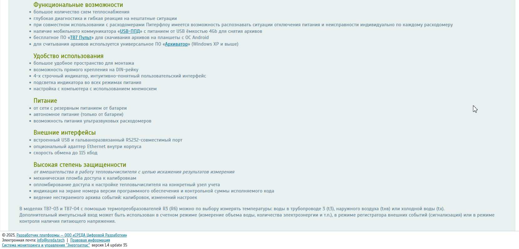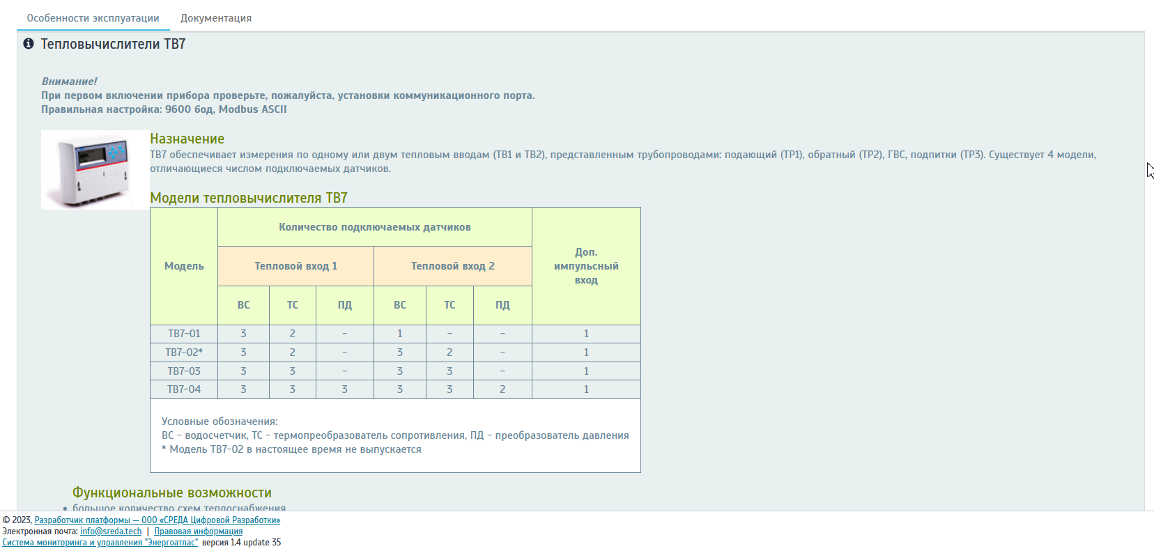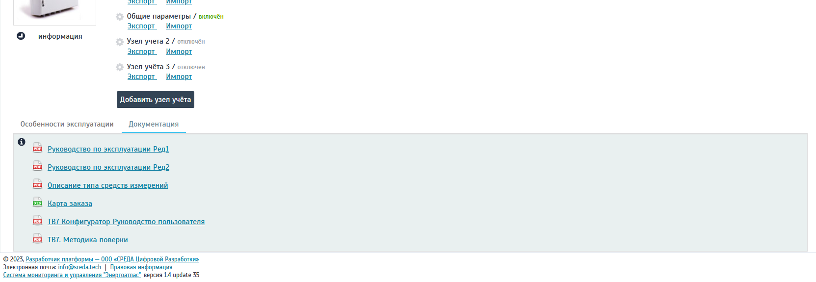 После нажатия мышкой на кнопку «Информация» под изображением прибора, становится доступен блок дополнительной информации о контроллере. В качестве дополнительной информации Вы увидите три закладки – Сервисное обслуживание, Особенности эксплуатации, Документация. В разделе «Сервисное обслуживание» Вам будет представлен список сервисных центров производителя оборудования, куда Вы можете обратиться для обслуживания данного устройства, получения консультаций и приобретения комплектующих. Вкладка «Особенности эксплуатации» предоставляет пользователю самую необходимую информацию об особенностях подключения устройства для корректной работы устройства в составе Энергоатлас и требуемых настройках устройства. В разделе «Документация» представлена основная документация (Руководства пользователя, Рекомендации по установке и подключению и т.п.) от производителя по Вашему оборудованию.