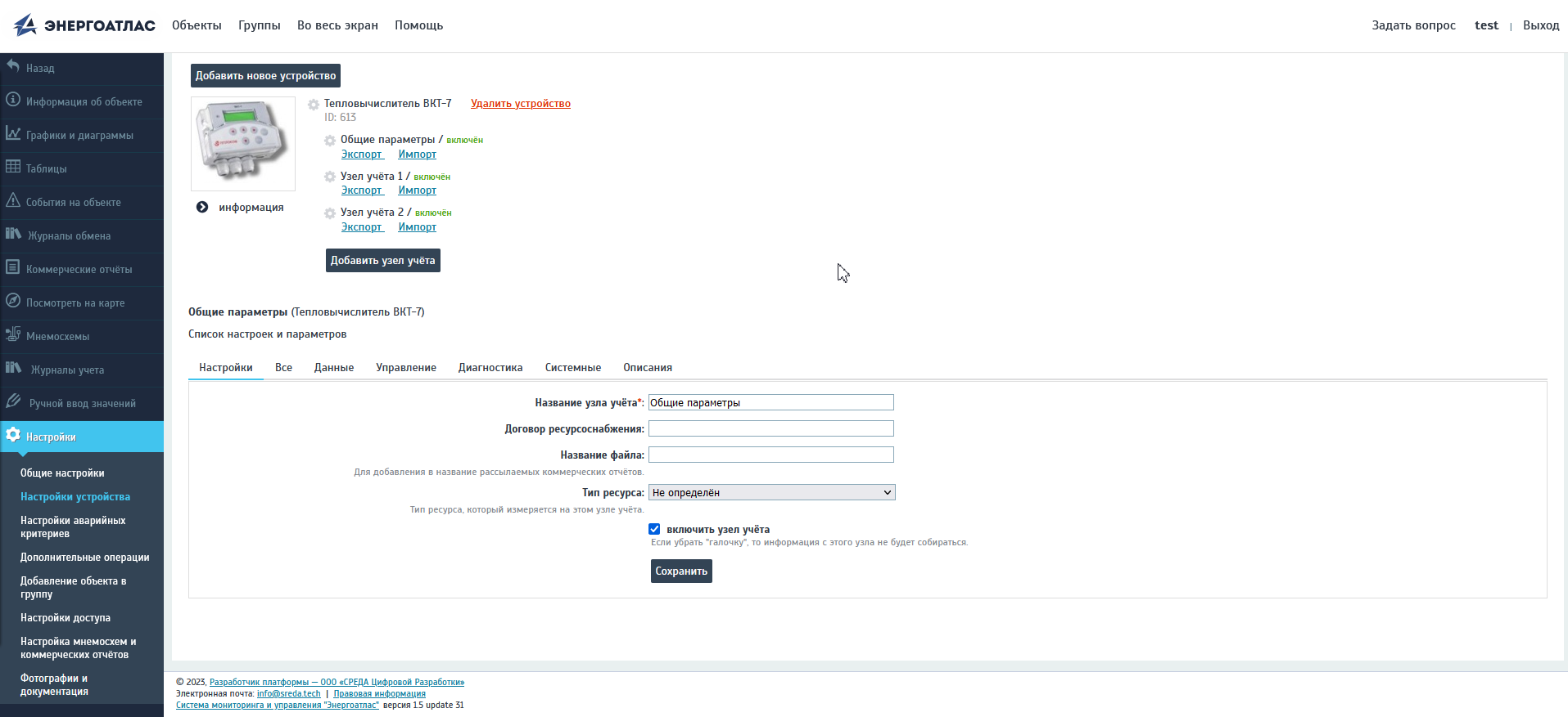 Узел учета «Общие параметры» (в системе является Узлом учёта 0) отключить невозможно. Список параметров этого узла фиксирован для конкретного прибора, однако возможно редактирование каждого из параметров. В том числе их можно сделать невидимыми в системе для пользователя.