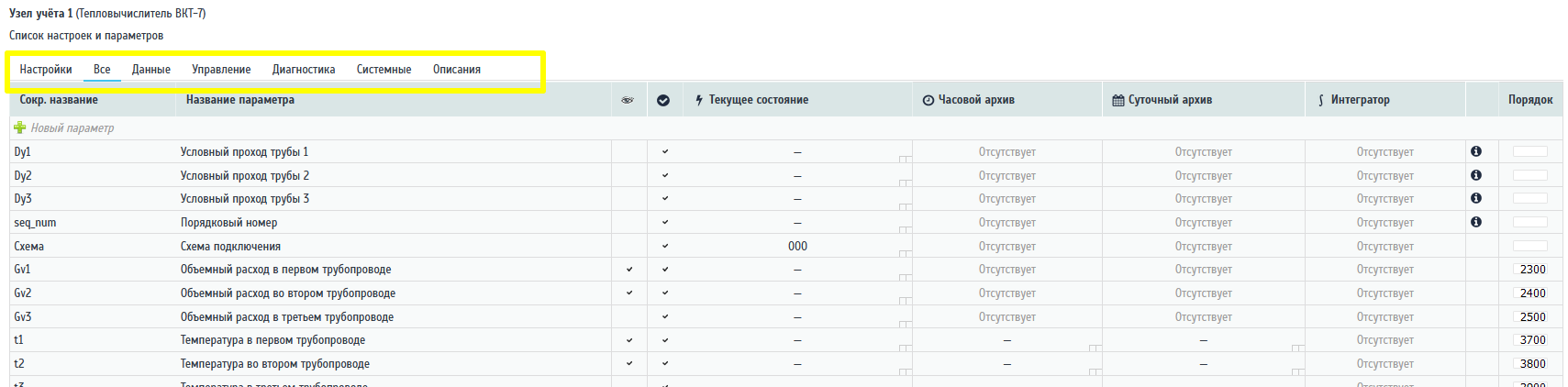 Для прехода к списоку параметров, необходимо перейти по закладкам "Все", "Данные" и т.д. Список параметров представлен в табличном виде и имеет ряд колонок. Напротив каждого параметра в этой таблице доступны данные прибора текущих значений, значений последнего часового архива, значений последнего суточного архива, значений интегратора (суммарные значения).