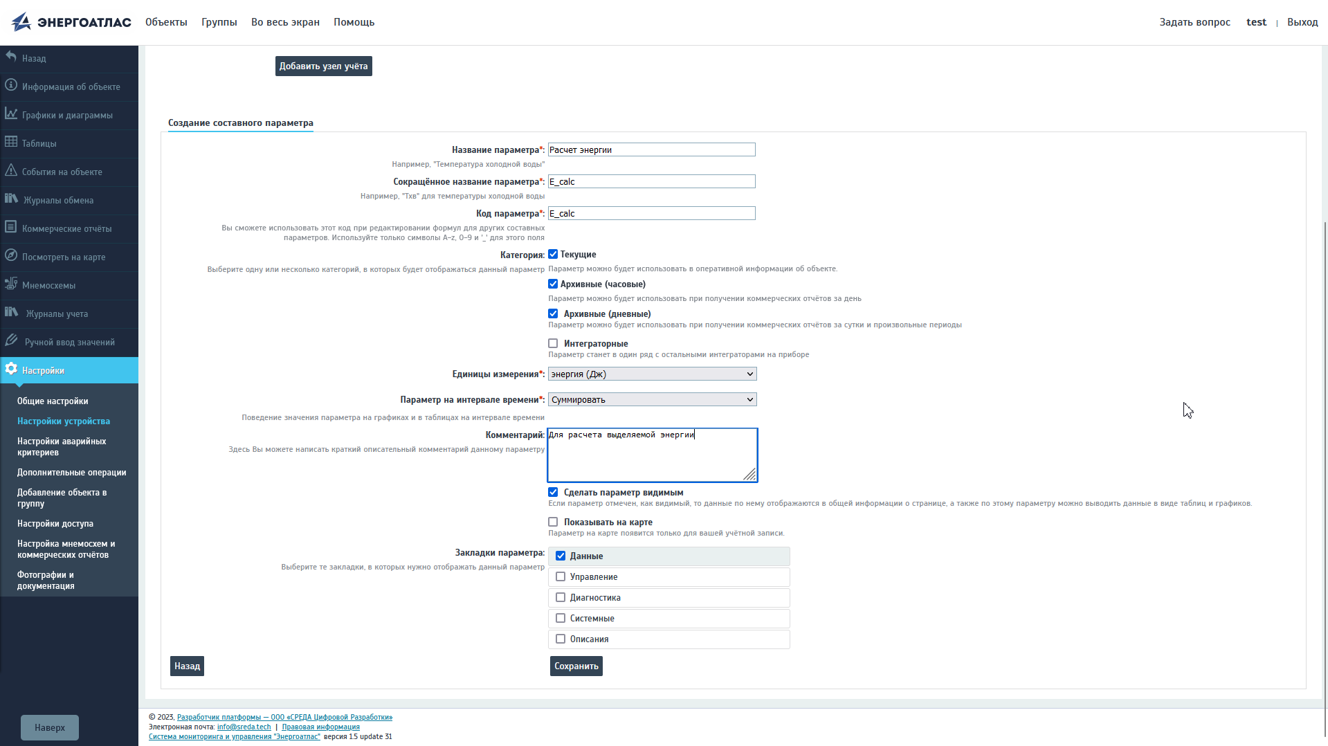 Пример: На удаленном объекте возникла необходимость организации учета электрической энергии. Это можно сделать путем подключения электросчетчика на свободный число-импульсный вход теплосчетчика, предназначенный для расходомеров. Выполнив все необходимые подключения, создаем в системе Энергоатлас новый собственный составной параметр, заполняем поле «Наименование параметра» и «Сокращенное название параметра».