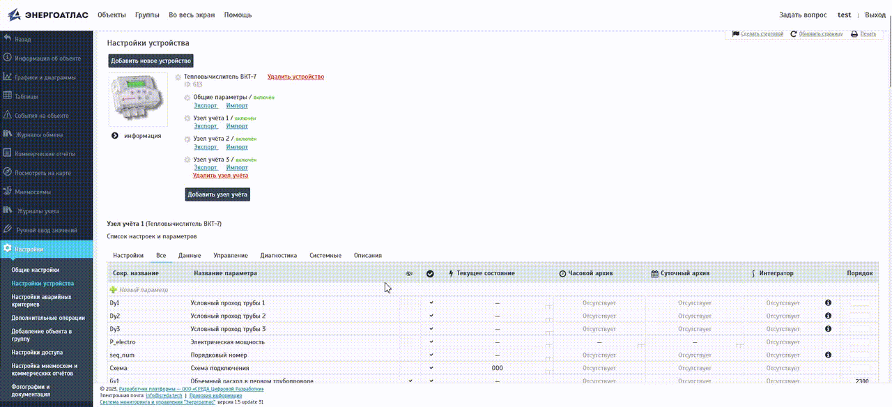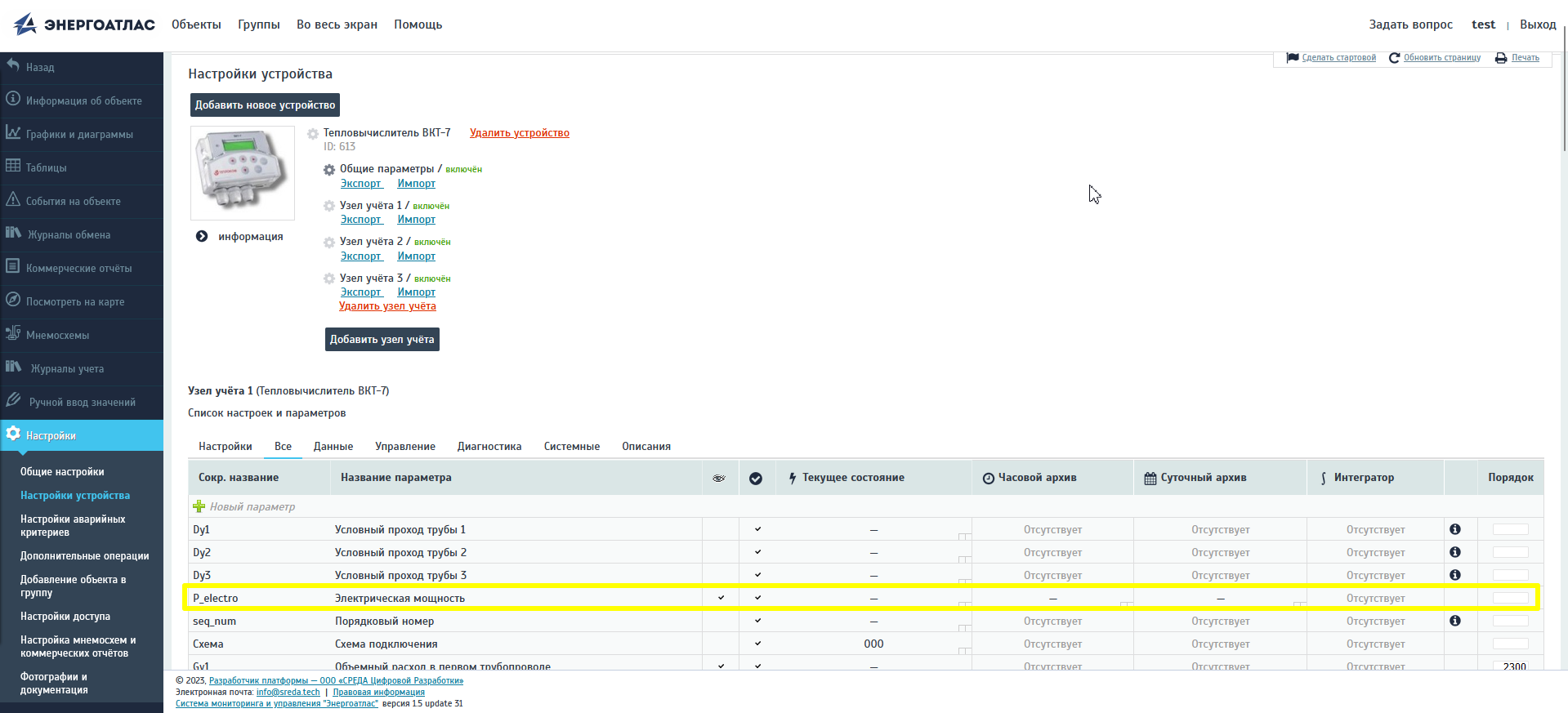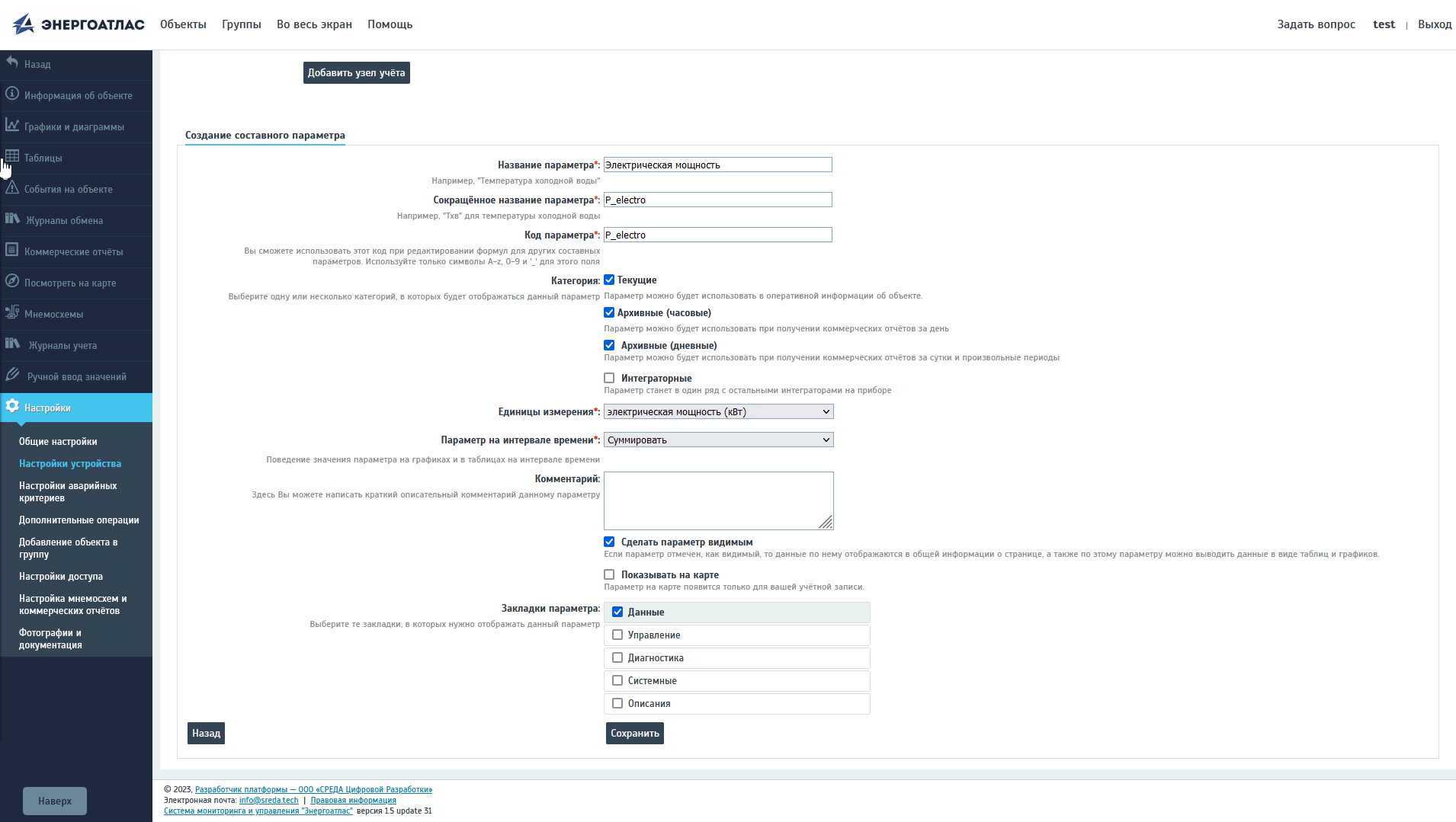 Затем придумываем уникальный код параметра. Выбираем категорию отмечая галочками Текущие, Часовы и Суточные значения. Указываем единицы измерения, для этого в поле «Единицы измерения» выбираем из ниспадающего меню – «Электрическая мощность, кВт». «Параметр на интервале времени» ставим "суммировать". Для удобства можем заполнить поле комментарий с пояснениями, где именно измеряется данная электрическая мощность. Делаем параметр видимым. В «Закладки параметра» отмечаем галочкой "Данные". После нажатия кнопки «Сохранить», форма полностью обновляется и появляется список параметров Узла учета с новым добавленным параметром.