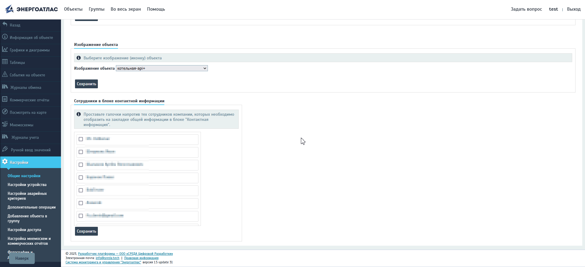 В нижней части раздела общих параметров находится «Блок контактной информации» - в данном списке представлены ключевые специалисты Вашей организации ответственные за эксплуатацию объекта и т.п. Здесь Вы можете проставить галочки напротив тех сотрудников компании, которых необходимо отобразить на закладке общей информации об объекте в блоке "Контактная информация". Список сотрудников предназначен для упрощения коммуникации с сотрудниками объекта, предприятия, с ключевыми специалистами, представителями аварийной службы, дежурного персонала, находящегося на объекте, и т.п. способными быстро принимать решения непосредственно по этому объекту в критических ситуациях.