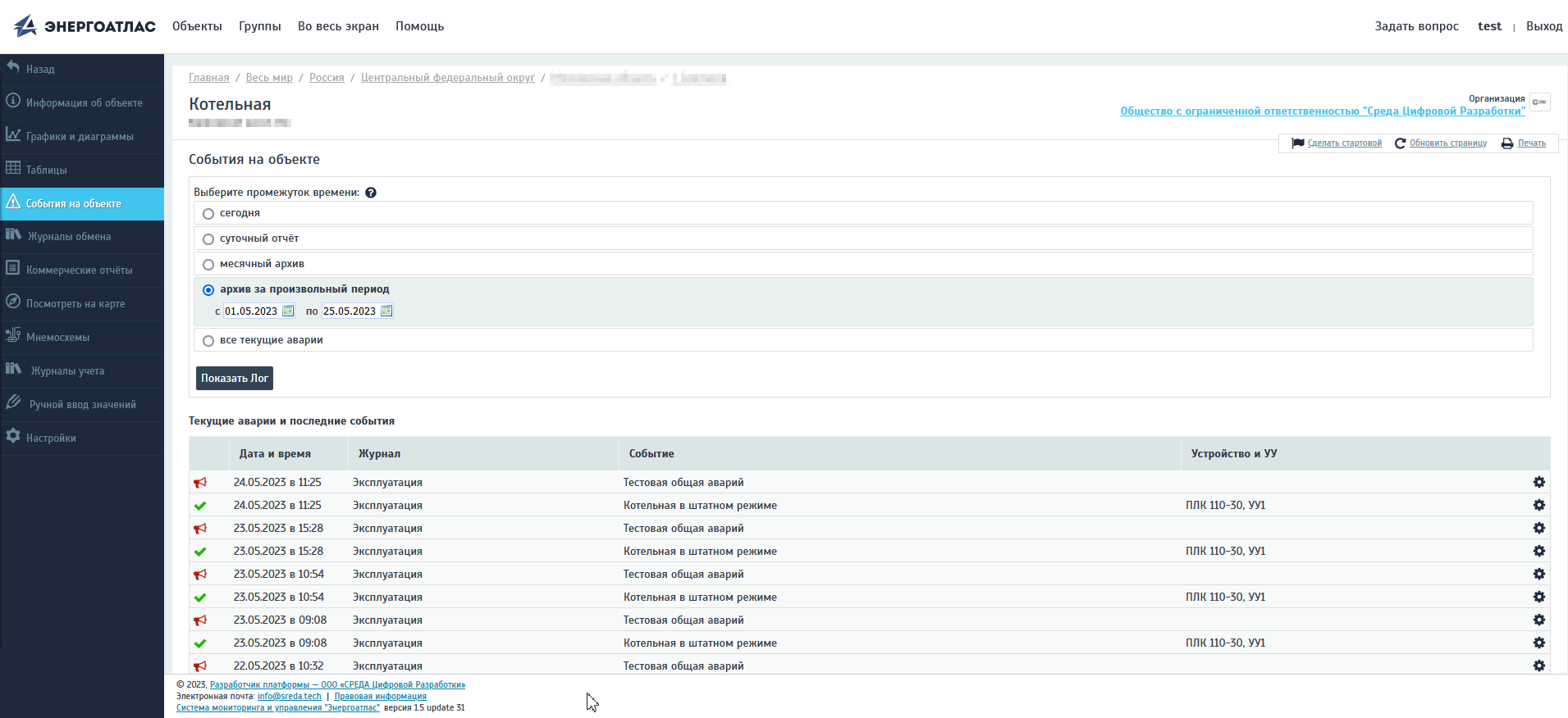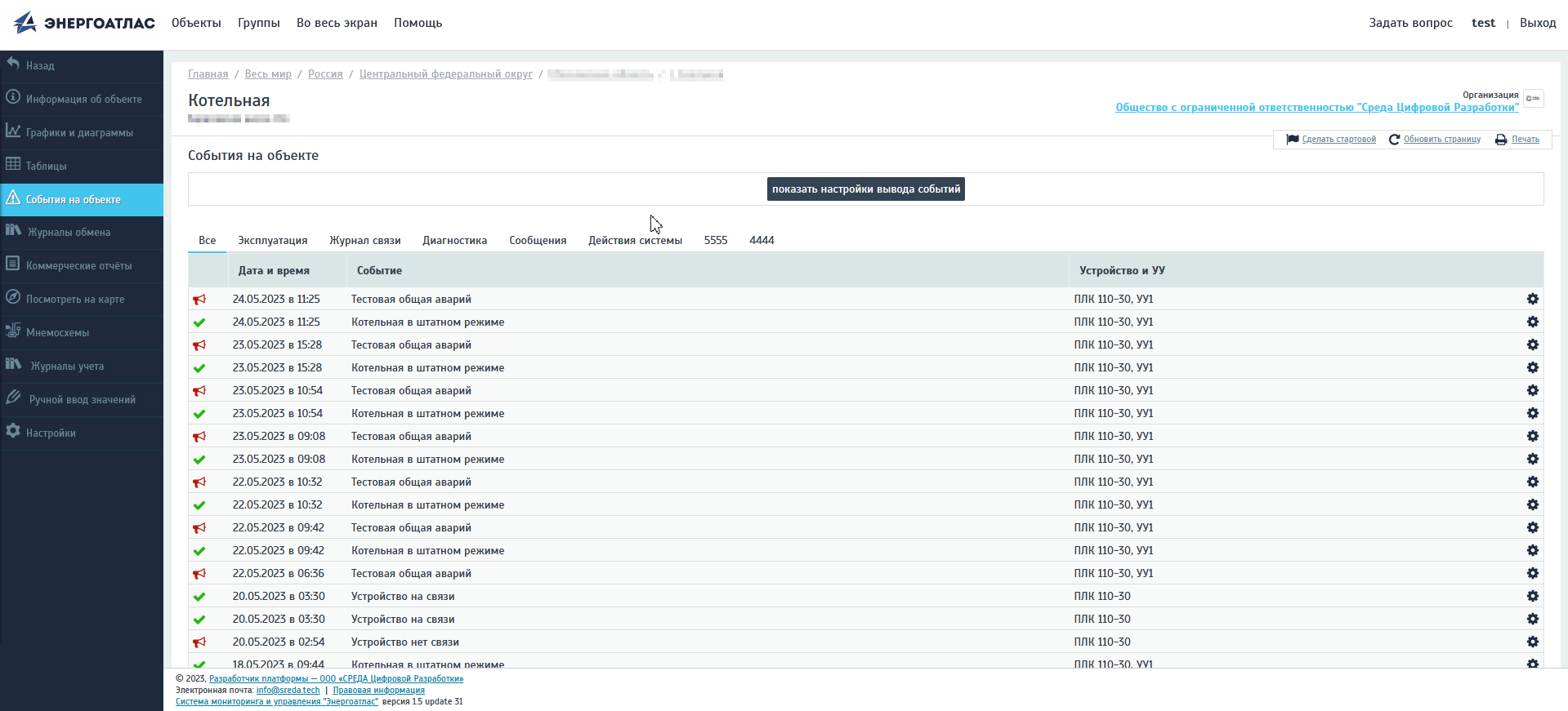 Для просмотра архива событий компании надо открыть вкладку «События на объекте» и выбрать требуемый временной интервал в поле параметров. Каждое сообщение имеет временную метку, когда оно произошло, название и адрес объекта, где оно произошло, текстовое сообщение, отражающее суть события и графическую метку для быстрого определения типа события.