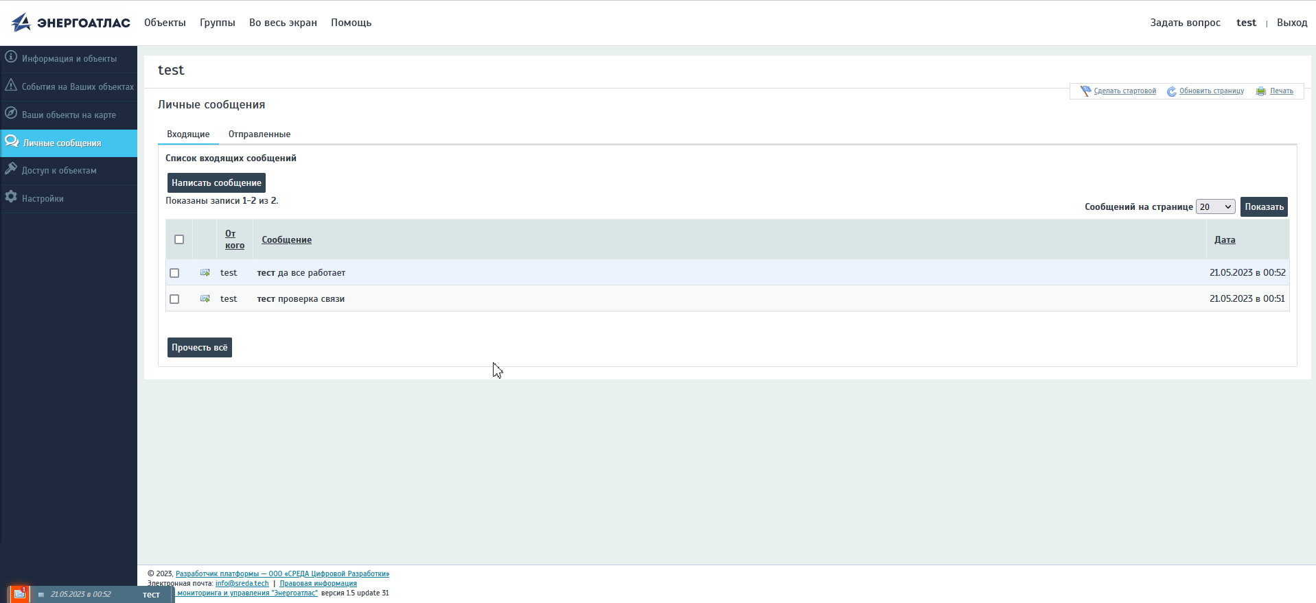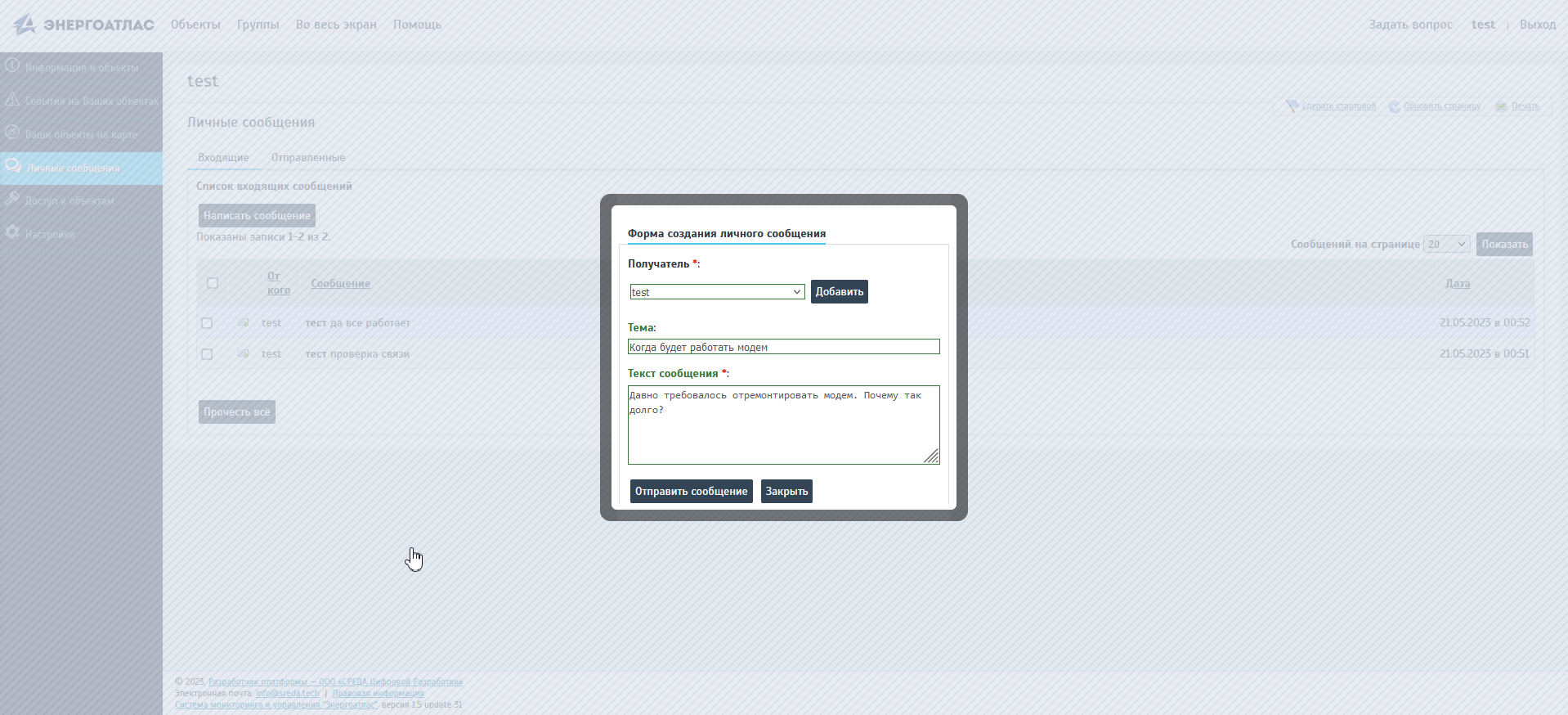 Страница предоставляет возможность отправки личных сообщений пользователям из своей компании. Это может быть как информационная рассылка о предстоящих мероприятиях в компании, так и служебные сообщения по вопросам эксплуатации объектов. Для этого необходимо нажать на кнопку «Написать сообщение». В открывшемся окне система предлагает выбрать получателей сообщения из числа зарегистрированных сотрудников компании, ввести тему и текст сообщения.