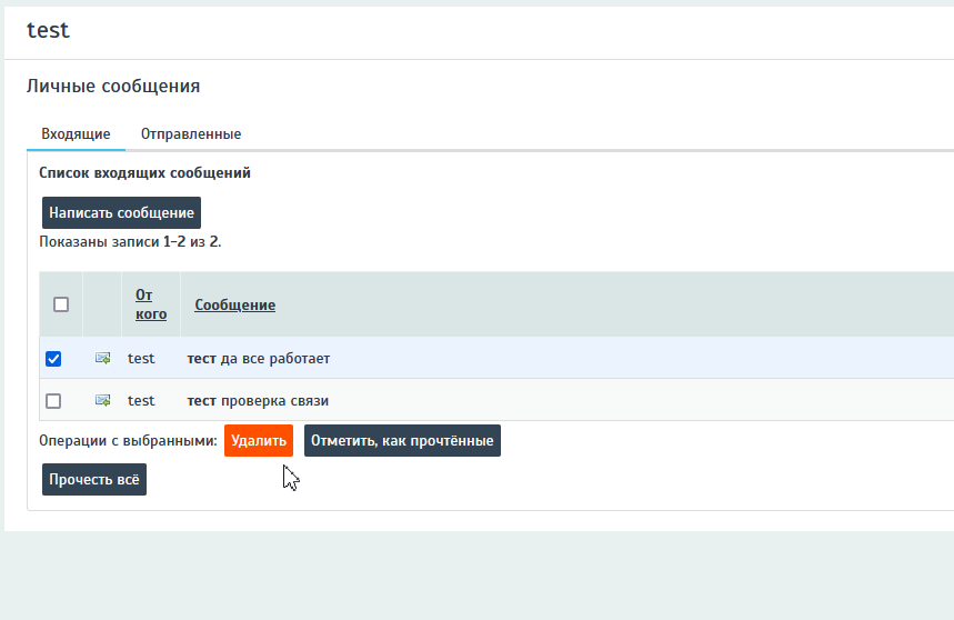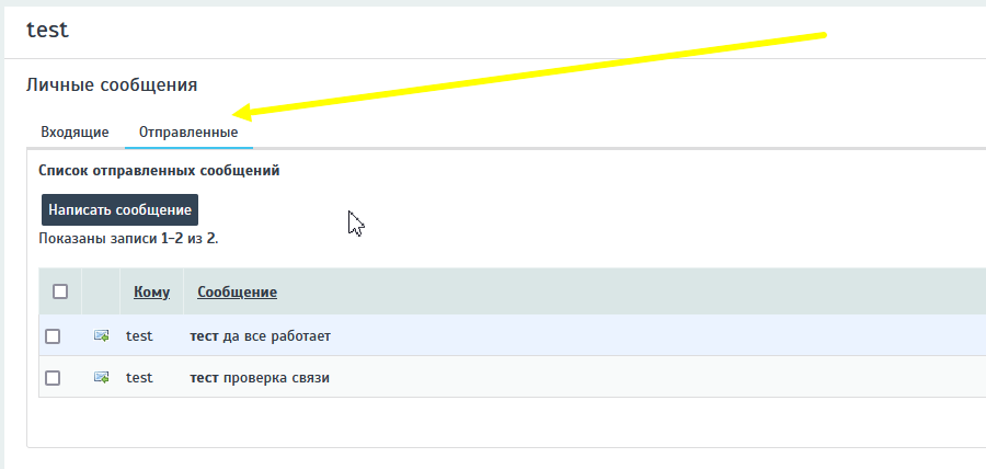 Переключение между списком полученных и отправленных сообщений происходит нажатием соответствующих кнопок над списком – «Входящие», «Отправленные».