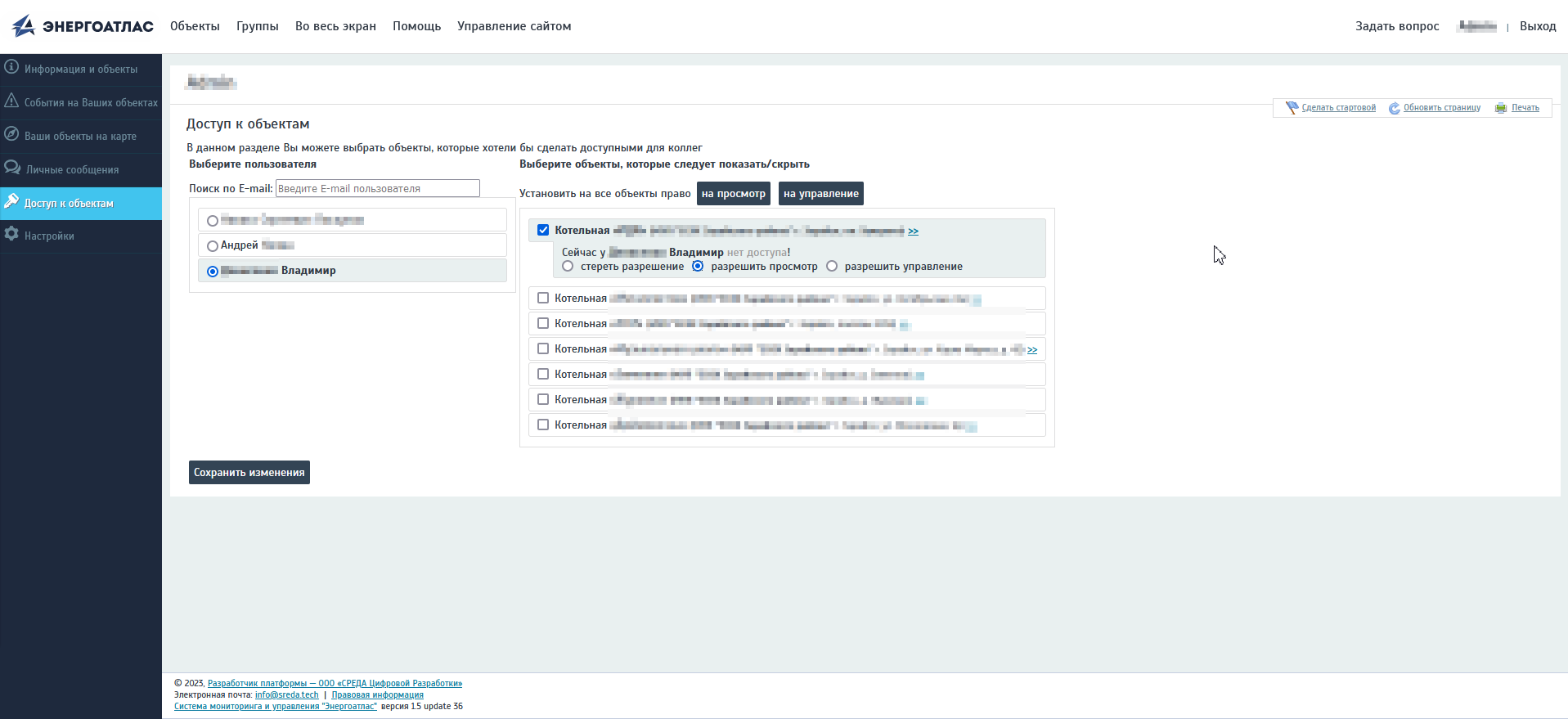 В разделе меню «Доступ к объектам» Вы можете выбрать объекты, которые хотели бы сделать доступными для коллег, а какие оставить скрытыми. Для этого необходимо в левом окне страницы выбрать сотрудника своей компании, а в правой части страницы выбрать объекты, которые следует показать/скрыть. Стоит отметить, что сотрудник компании без администраторских прав не сможет дать или закрыть доступ сотруднику с администраторскими правами, то есть невозможно ограничить доступ пользователю с большим, чем Ваш уровень доступа к объектам. В случае если Вы обладаете администраторскими правами, то Вам позволено разрешить пользователю только просмотр объекта, либо разрешить пользователю полное управление объектом.