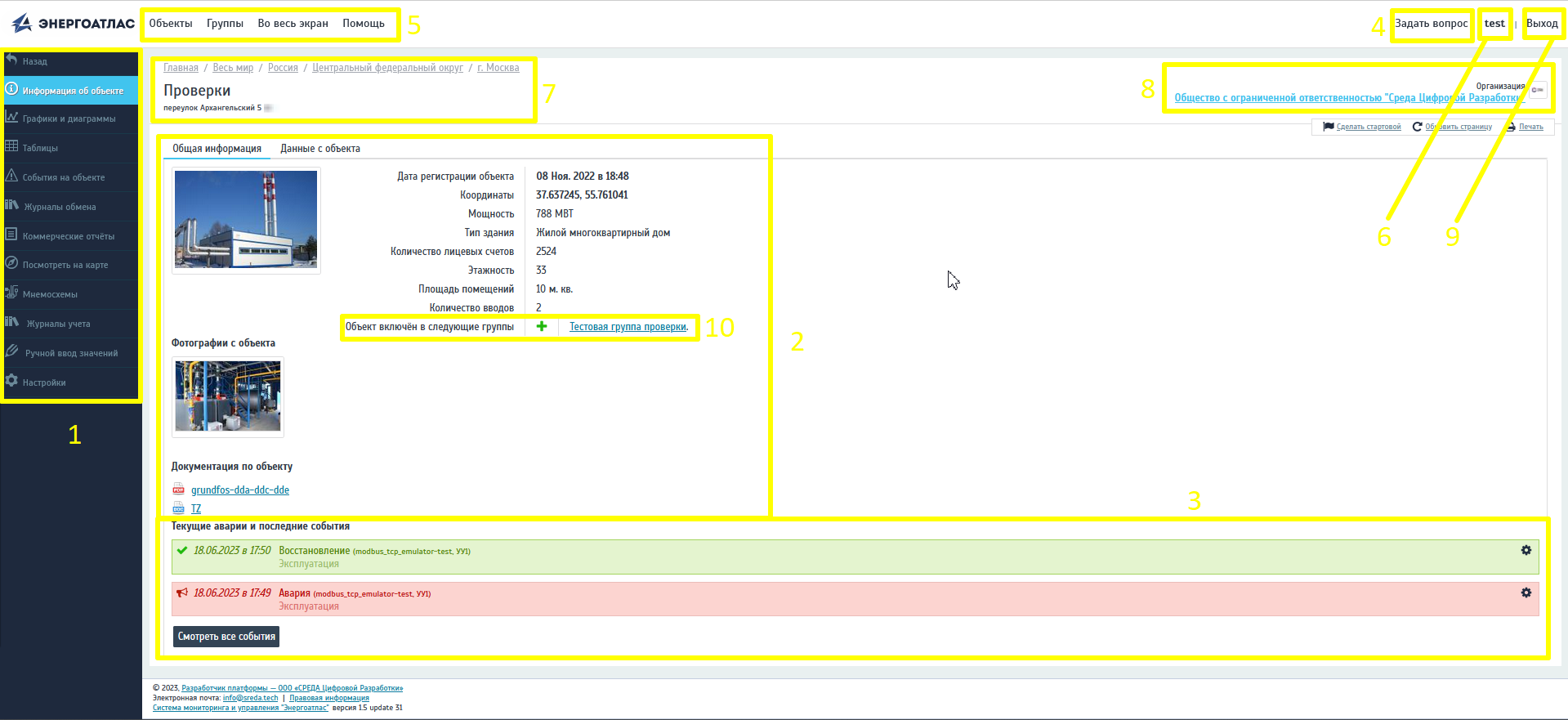 Поле функциональных закладок расположено в левой части экрана. Отображает доступные в текущей конфигурации функции Системы. Действие всех функциональных закладок распространяется только на «активный объект», отображённый в правом поле «2».
