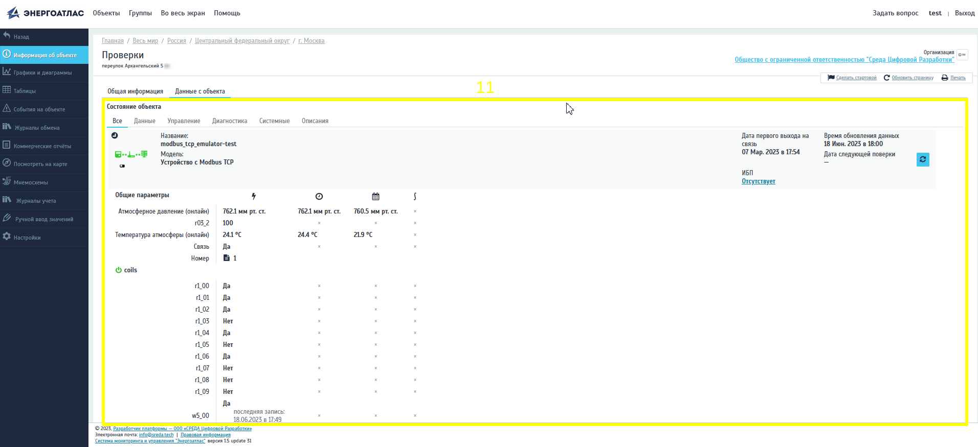 Поле просмотра параметров «Состояние объекта». Здесь отображаются активные параметры и приборы.